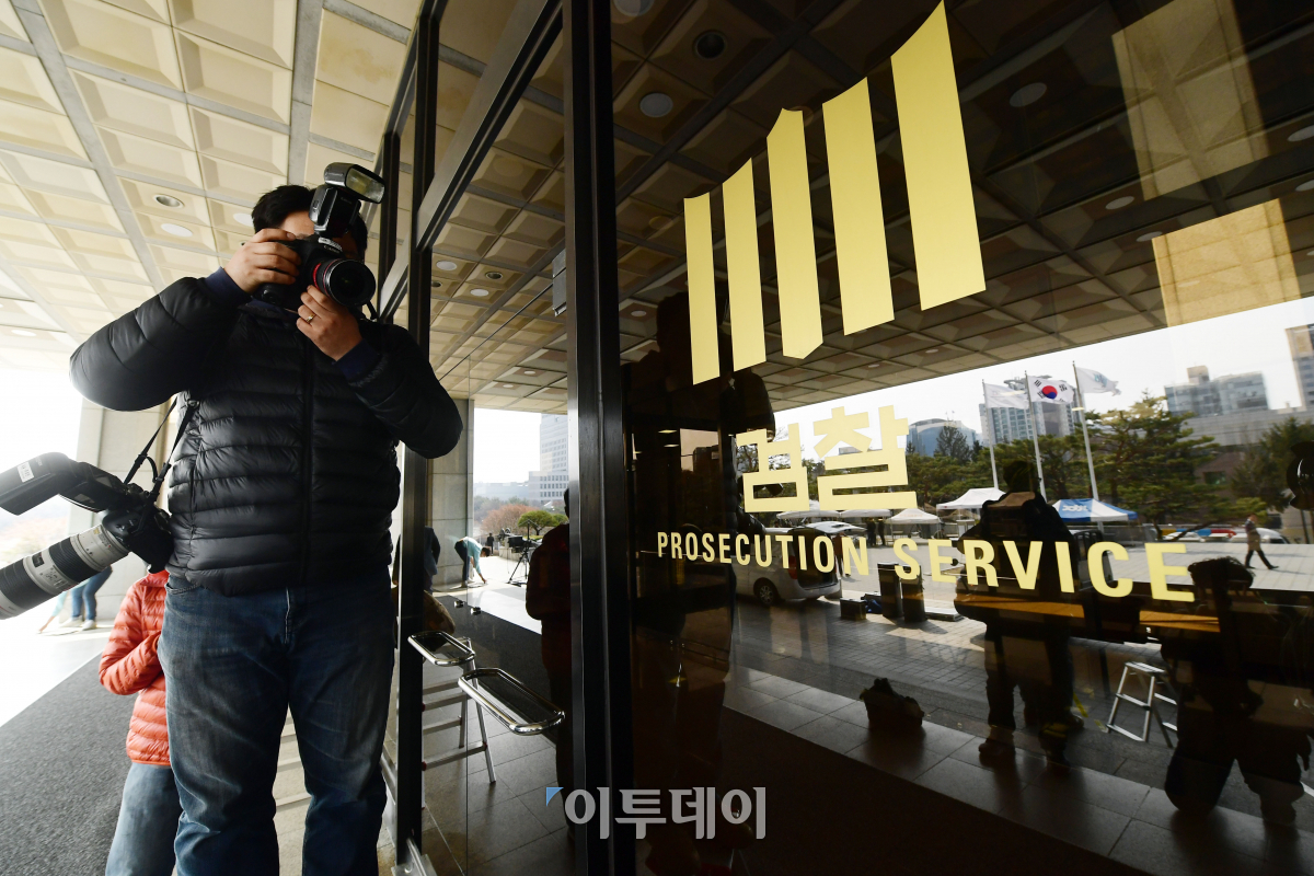 이명박 전 대통령의 검찰소환을 하루 앞둔 13일 서울중앙지검에서 취재진들이 포토라인을 정리하는 등 준비작업을 하고 있다. 이동근 기자 foto@