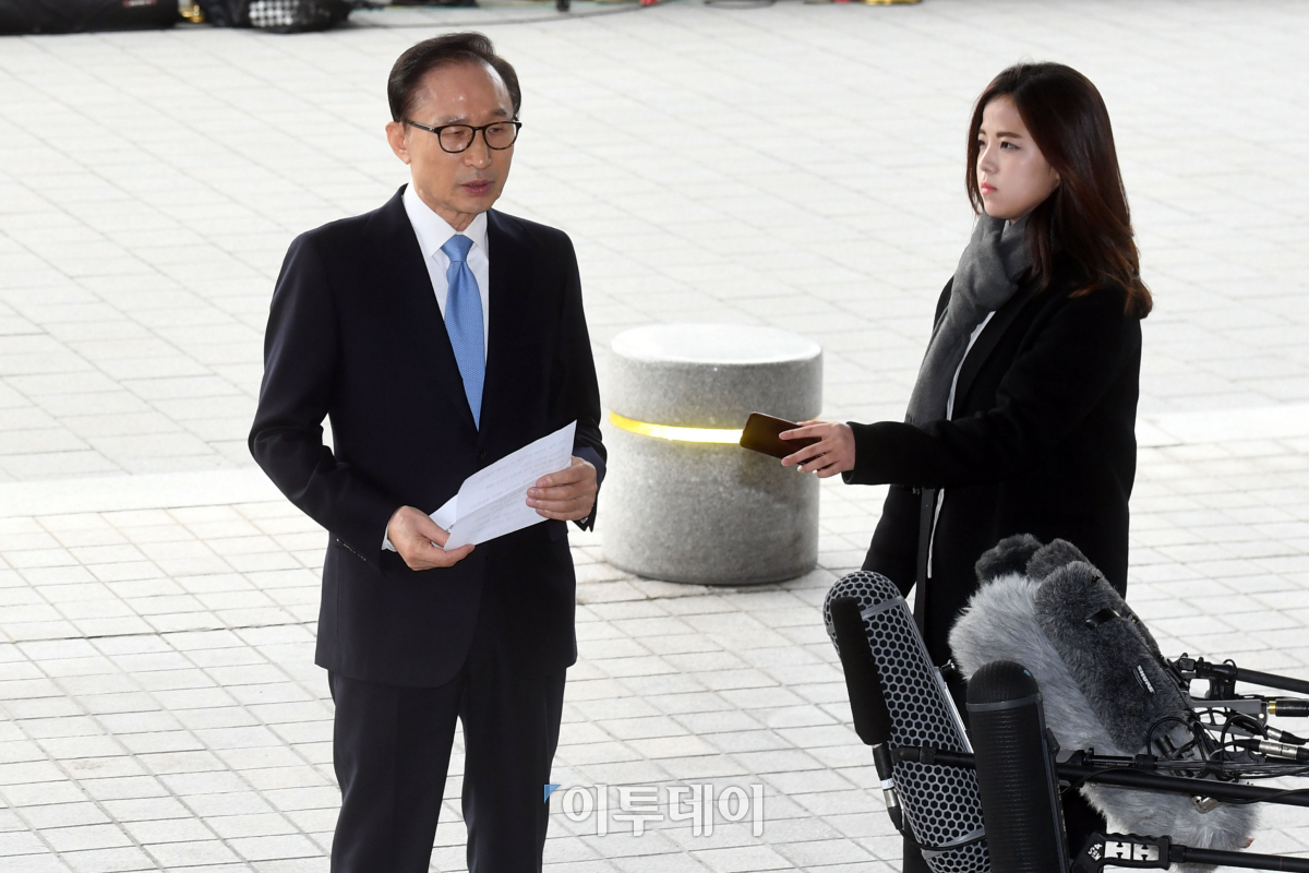 이명박 전 대통령이 14일 오전 서울중앙지검에 피의자 신분으로 출석하며 입장을 밝히고 있다. 뇌물, 직권남용 등 20여 개의 혐의를 받는 이 전 대통령은 검찰조사를 받는 역대 5번 째 전직 대통령이 된다. 이동근 기자 foto@