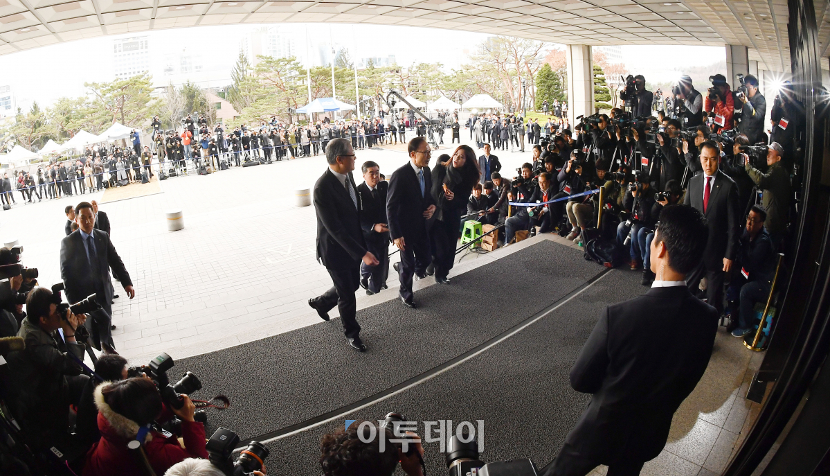 이명박 전 대통령이 14일 오전 서울중앙지검에 피의자 신분으로 출석하고 있다. 뇌물, 직권남용 등 20여 개의 혐의를 받는 이 전 대통령은 검찰조사를 받는 역대 5번 째 전직 대통령이 된다. 이동근 기자 foto@