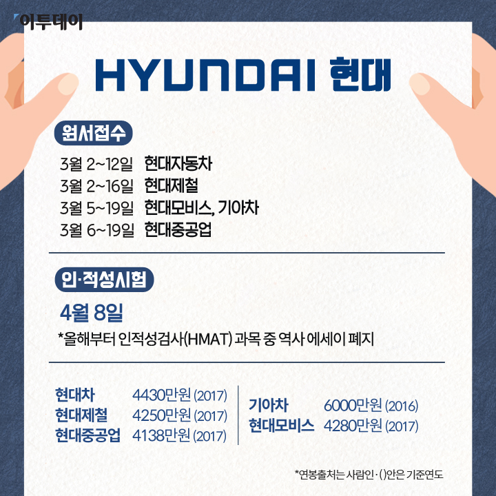 현대는 이달 초부터 대졸 공채 신입사원 원서접수를 받고 있습니다. 현대 인·적성검사 과목 중 역사 에세이는 올해부터 폐지됩니다. 현대 계열사별 원서접수 기간과 현대차, 현대모비스, 현대중공업, 현대제철 등의 대졸 초임 연봉입니다.