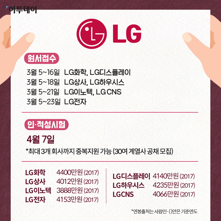 LG는 계열사별로 16~23일까지 대졸자 신입사원 원서를 받는다. LG는 다른 대기업과 달리 최대 3곳까지 중복지원이 가능하다. LG 계열사별 원서접수 기간과 LG화학, LG디스플레이, LG상사, LG전자 등 2017년 대졸 초임 연봉을 알아본다.