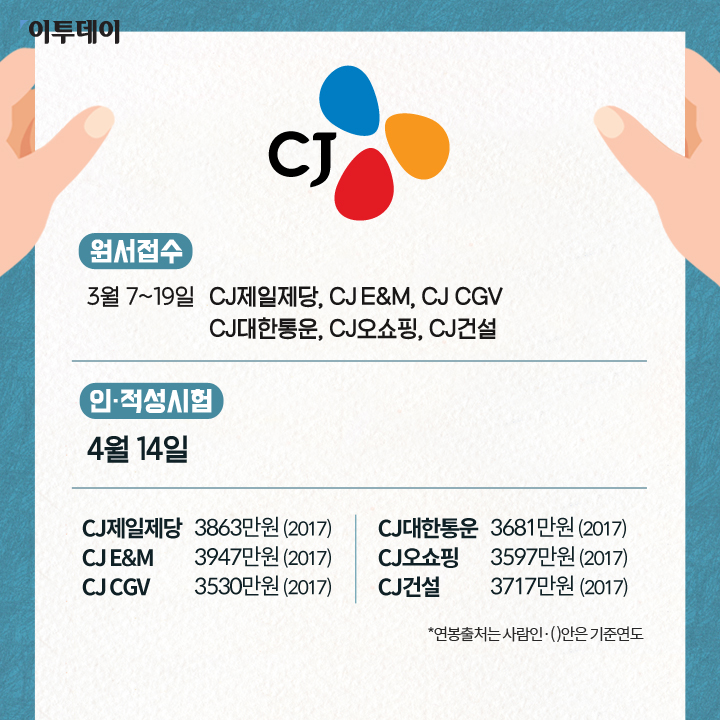 CJ 계열사들은 이달 19일까지 대졸 신입사원 원서를 받는다. 인·적성 시험은 일괄적으로 내달 14일 치러진다. CJ 제일제당, CJ CGV, CJ 건설, CJ 대한통운 등 작년 대졸 초임 정보를 모았다.