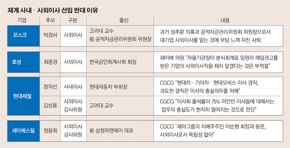 세아베스틸이 사외이사로 재선임하려는 정용희 현 사외이사도 곱지 못한 시선을 받고 있다. 세아그룹의 지배주주인 이순형 회장과 동문이라는 이유에서다. CGCCG는 정 후보에 대해 “이 회장과 고등학교 동문이자 대학 선배”라며 “한국적 상황 하에서 지배주주 일가 및 대표이사와 동문·동창인 경우 사외이사로서 독립성이 없다고 판단한다”고 했다.