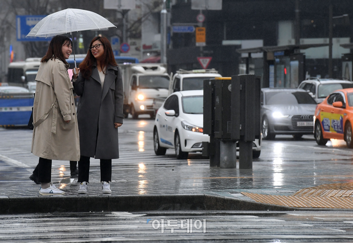 봄비가 내린 15일 오전 서울 광화문 사거리에서 시민들이 우산을 쓴 채 횡단보도 신호를 기다리고 있다. 기상청은 저기압의 영향으로 전국이 흐리고 비가 오겠으나 중부지방은 오후부터 차차 그칠 것으로 예보했다. 이동근 기자 foto@