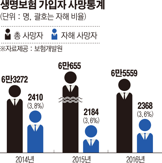 15일 이투데이가 보험개발원을 통해 받은 ‘생명보험 사망원인별 사망자수 현황’ 자료에 따르면 2014~2016년 3년간 생명보험 가입자 중 사망한 사람은 18만9486명이었다. 이 중 자해에 의한 사망자는 6962명이다. 전체의 3.7%에 달하는 셈이다. 하지만 여기서 자살에 해당하는 방식에는 교수, 압박 및 질식과 높은 곳에서 뛰어내림에 의한 의도적 자해만을 포함하고 있다. 그 외 다른 방식의 자살까지 포함하면 자살자 비율은 더 높을 것으로 보인다.