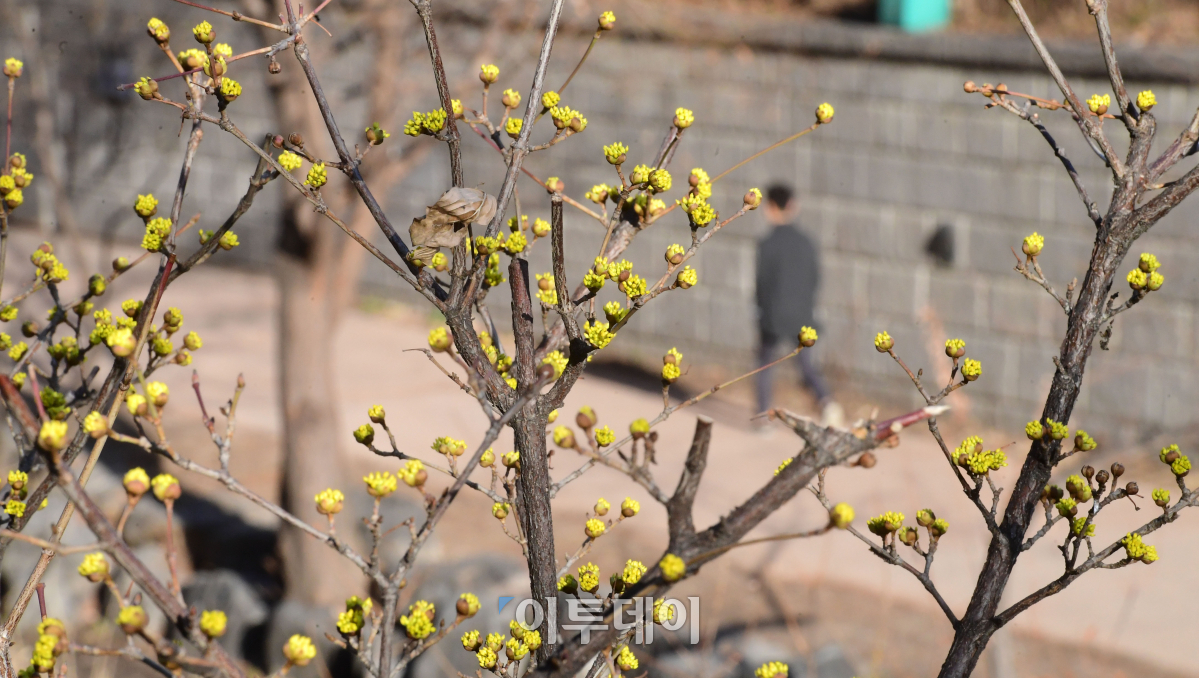 16일 오전 서울 청계천에서 봄의 전령 산수유가 노란 꽃망울을 터트리고 있다. 기상청은 대기 확산이 원활해 미세먼지 농도가 모든 권역에서 '좋음' 수준을 보일 것으로 예보했다. 고이란 기자 photoeran@