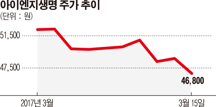 15일 아이엔지생명은 전날보다 3.70% 떨어진 4만6800원에 거래를 마쳤다. 9일 시장에서 최대 주주가 지분 매각을 추진하고 있다는 소식이 전해진 뒤로 줄곧 내림세다. 회사 측은 공시를 통해 “결정된 사항이 없다”고 해명했지만, 매각 이슈가 불거진 뒤 이날까지 주가는 6.21% 떨어졌다. 같은 기간 코스피 보험업종지수(-0.40%)와 비교할 때도 낙폭이 크다.