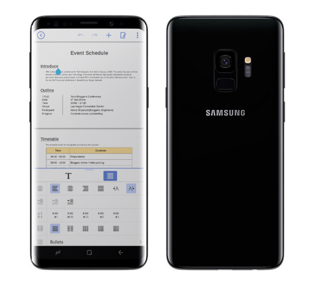 한컴오피스 S는 지난해 출시된 ‘갤럭시 S8’과 ‘갤럭시 노트8’에 이어 ‘갤럭시 S9’, ‘갤럭시 S9+’에도 탑재하며 워드와 엑셀, 파워포인트 등 MS오피스 문서와의 호환성을 높였다.