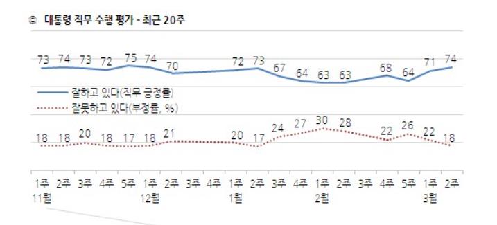 한국갤럽이 13~15일 전국 성인 1003명을 대상으로 설문한 결과(신뢰수준 95%에 표본오차 ±3.1%포인트)에 따르면 문 대통령의 직무수행에 대해 긍정적으로 평가한 응답자는 지난주보다 3%포인트 오른 74%로 집계됐다.