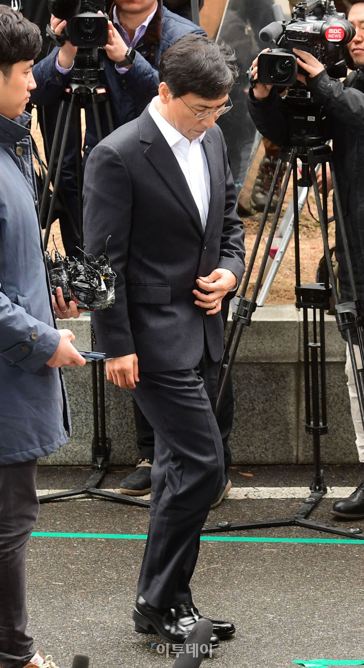 수행비서 성폭행 혐의를 받는 안희정 전 충남도지사가 19일 오전 서울 마포구 서부지검에 출석하고 있다. 검찰은 혐의 인정 여부, 증거인멸 가능성 등을 검토해 구속영장 청구 여부를 결정할 방침이다. 고이란 기자 photoeran@