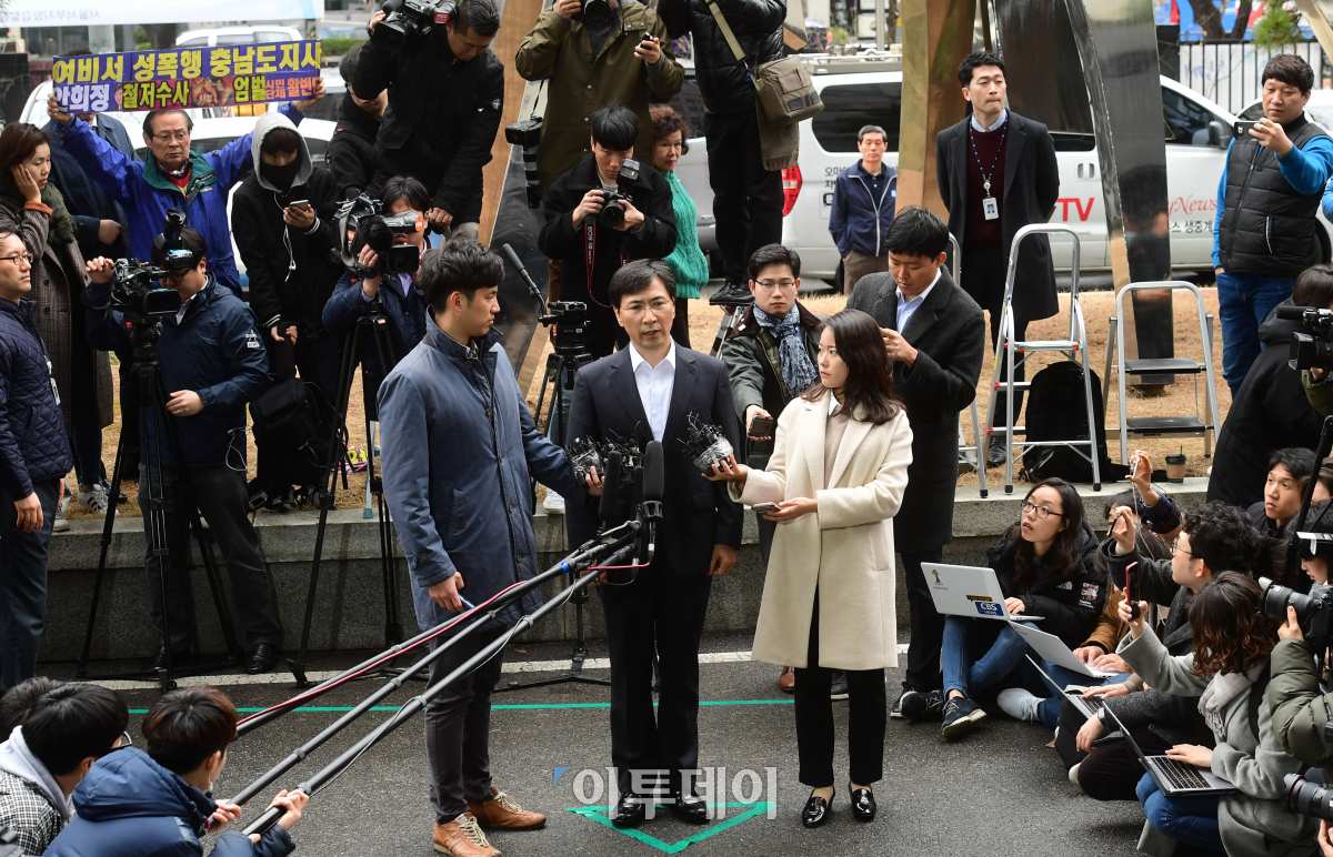 수행비서 성폭행 혐의를 받는 안희정 전 충남도지사가 19일 오전 서울 마포구 서부지검에 출석하고 있다. 검찰은 혐의 인정 여부, 증거인멸 가능성 등을 검토해 구속영장 청구 여부를 결정할 방침이다. 고이란 기자 photoeran@