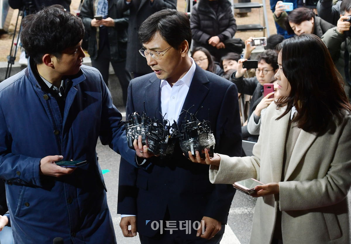 수행비서 성폭행 혐의를 받는 안희정 전 충남도지사가 19일 오전 서울 마포구 서부지검에 출석하고 있다. 검찰은 혐의 인정 여부, 증거인멸 가능성 등을 검토해 구속영장 청구 여부를 결정할 방침이다. 고이란 기자 photoeran@