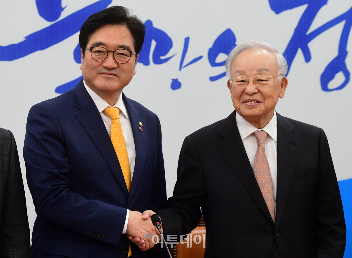 우원식(왼쪽) 더불어민주당 원내대표가 19일 서울 여의도 국회를 방문한 손경식 경총 신임회장과 악수를 하고 있다. 고이란 기자 photoeran@