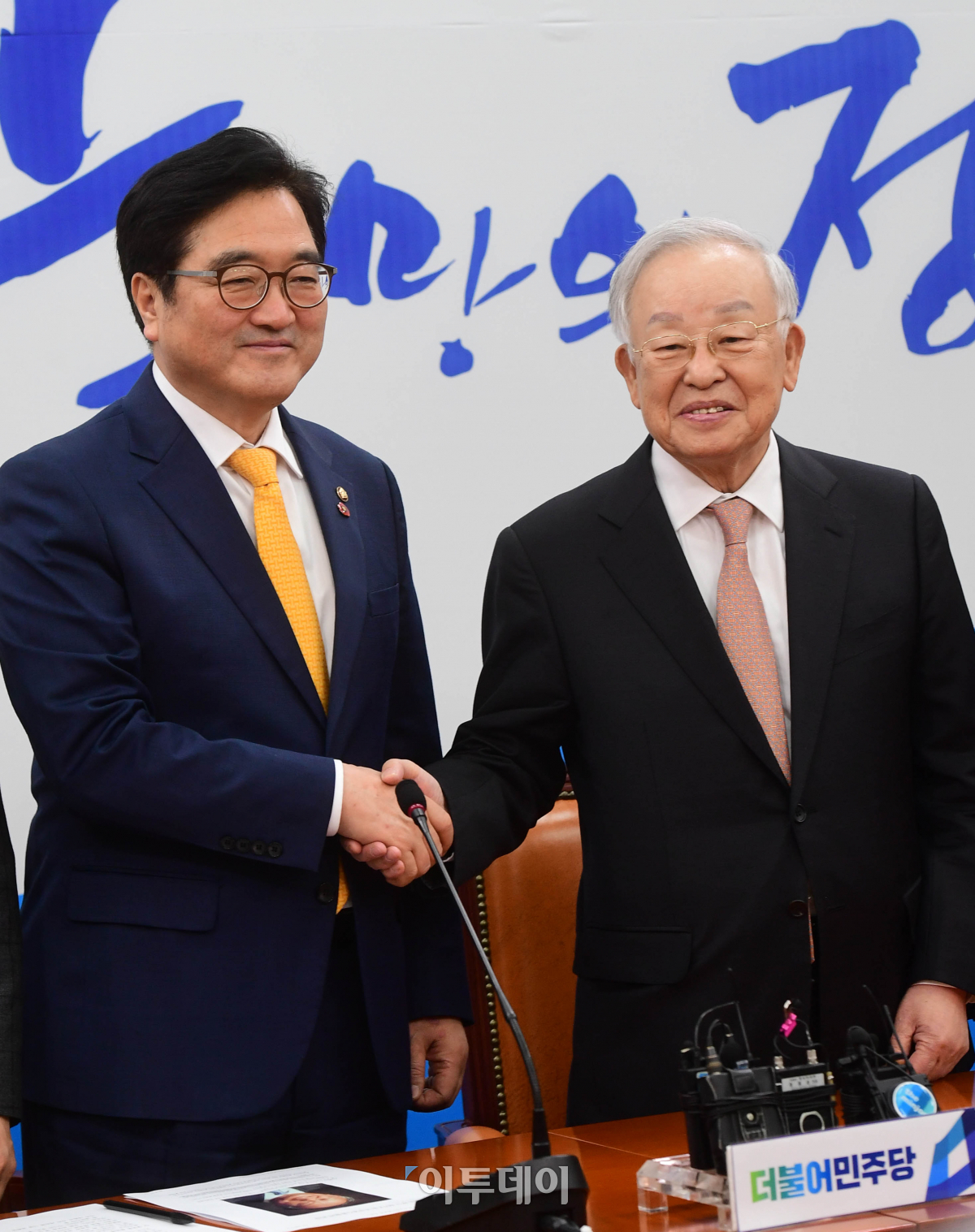 우원식(왼쪽) 더불어민주당 원내대표가 19일 서울 여의도 국회를 방문한 손경식 경총 신임회장과 악수를 하고 있다. 고이란 기자 photoeran@