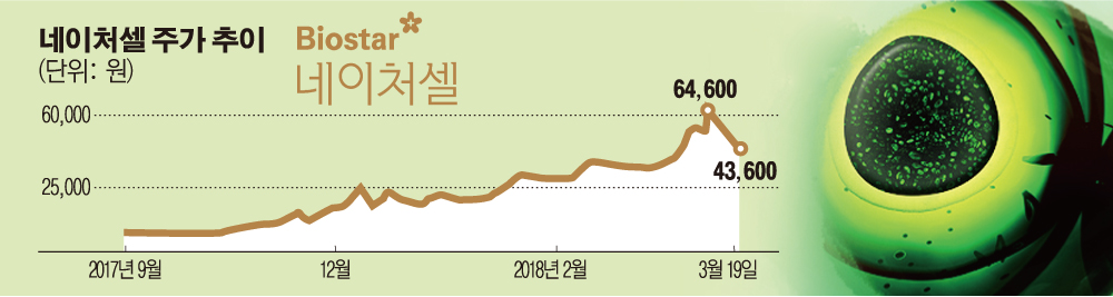 네이처셀의 주가는 지난해 하반기부터 급등세를 보여왔다. 지난해 9월 5000원대에 불과하던 주가는 연말 바이오주 급등에 2만 원을 훌쩍 넘기며 한 해를 마무리했다. 상승세는 올해도 계속됐다. 3월 16일에는 장중 6만4600원을 찍으면서 불과 7개월만에 10배가량의 상승세를 보였다. 주가가 급등세를 보인 기간 외국인 지분율도 부쩍 늘어났다. 올 초 1%도 미만이었던 외국인 지분율은 어느새 3%를 넘어섰다.