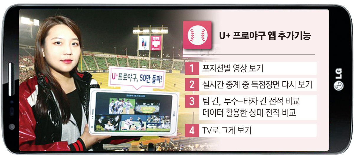 U+프로야구 앱은 ‘최대 5경기 동시 시청’, ‘나만의 응원팀 맞춤화면’, ‘광고 없이 바로 중계 시청’과 같은 차별화된 기능으로 출시 6개월 만에 누적 이용자 108만 명을 돌파하면서 대표 야구 플랫폼으로 자리 잡았다. 사용자가 늘면 추후 경쟁사에 전면 개방해 SK텔레콤의 ‘T맵’처럼 1등 플랫폼을 만들겠다는 목표도 세운 것으로 알려졌다.