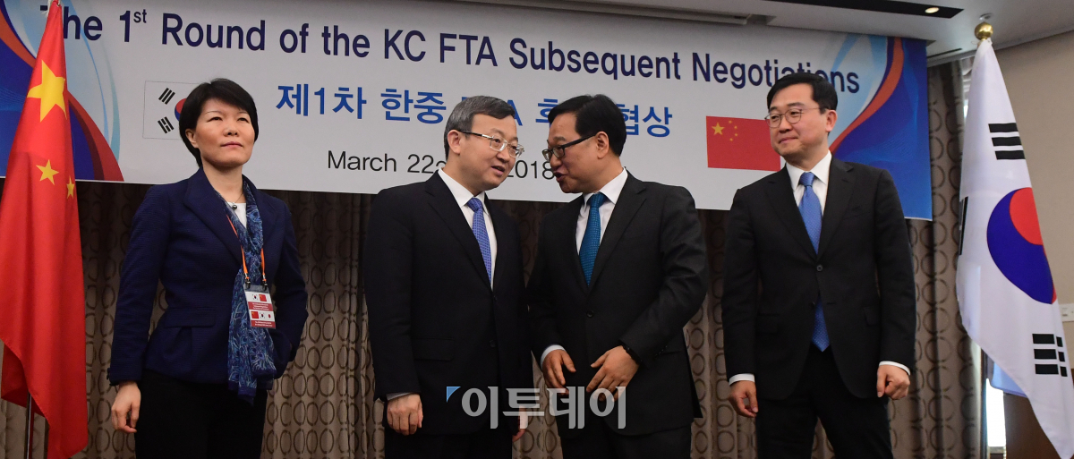 김영삼(오른쪽에서 두번째) 산업통상자원부 무역투자실장과 왕셔우원 상무부 부부장이 22일 오전 서울 중구 명동 롯데호텔에서 열린 한중 FTA 서비스·투자 1차 후속협상에서 대화를 하고 있다. 고이란 기자 photoeran@