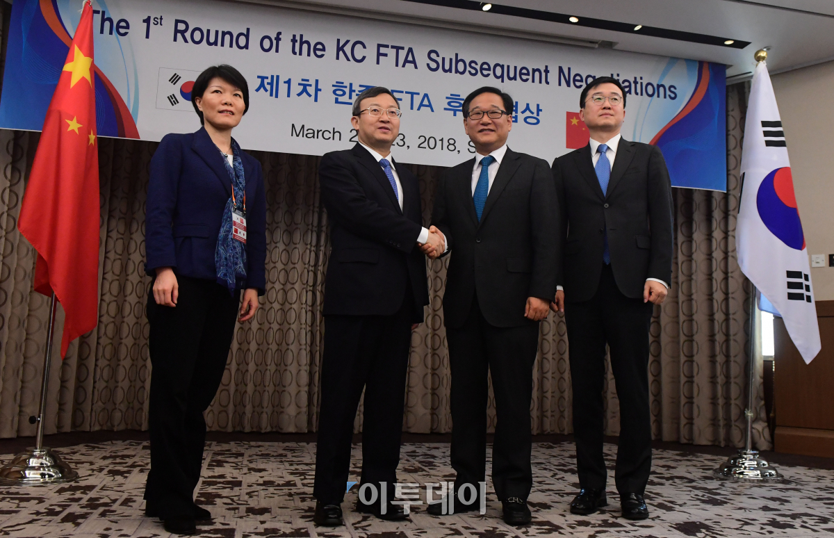 김영삼(오른쪽에서 두번째) 산업통상자원부 무역투자실장과 왕셔우원 상무부 부부장이 22일 오전 서울 중구 명동 롯데호텔에서 열린 한중 FTA 서비스·투자 1차 후속협상에서 악수를 하고 있다. 고이란 기자 photoeran@