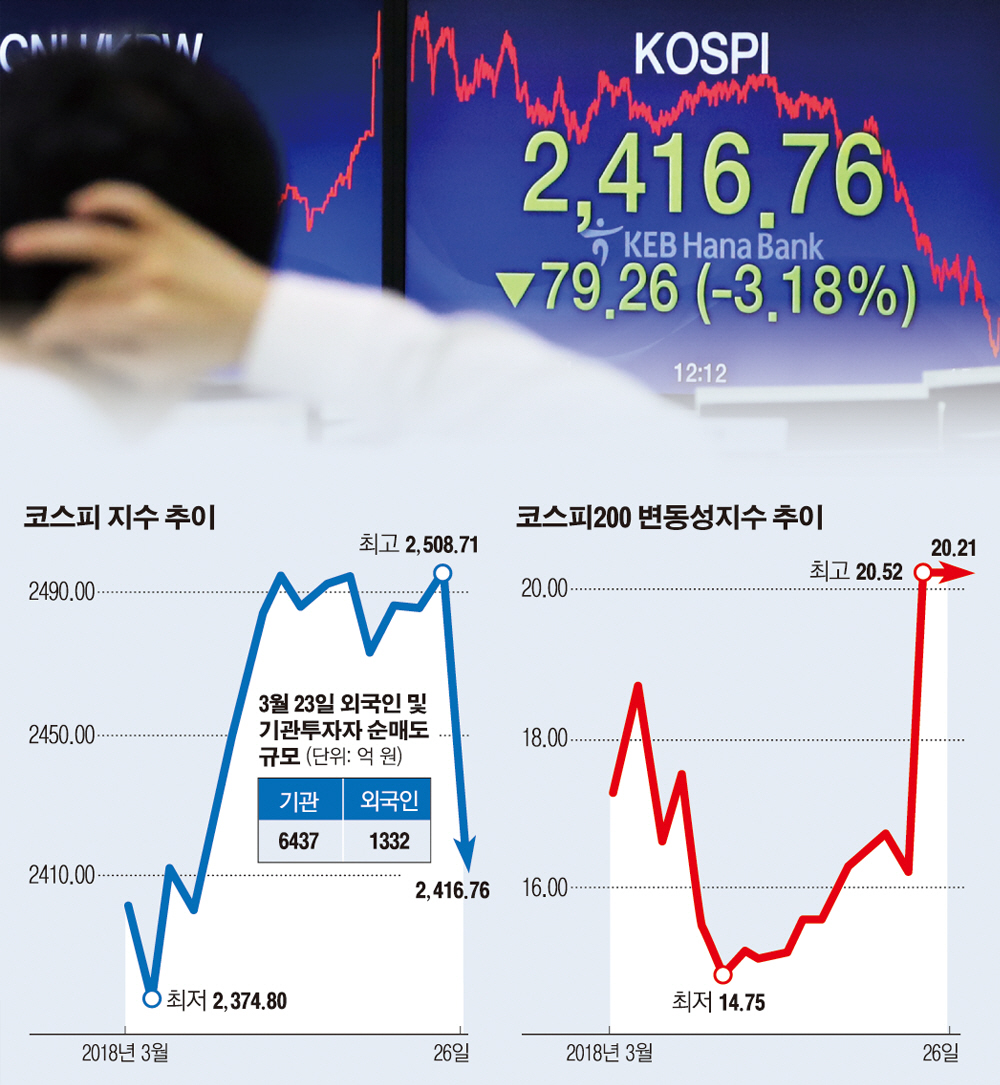 코스피지수가 급락한 배경은 미국과 중국의 무역전쟁 우려로 글로벌 금융시장의 투자심리가 급격히 얼어붙은 영향이 컸다. 트럼프 대통령이 중국산 수입품에 500억 달러(약 54조 원)의 천문학적 관세를 부과하고 중국의 미국 투자를 제한하는 초강경 조치를 발표하면서 글로벌 금융시장의 투자심리가 급격히 얼어붙었다. 이에 중국 정부는 같은 날 30억 달러(약 3조2400억 원)에 이르는 미국산 철강과 돈육 등에 보복관세를 부과할 것이라고 맞섰다.