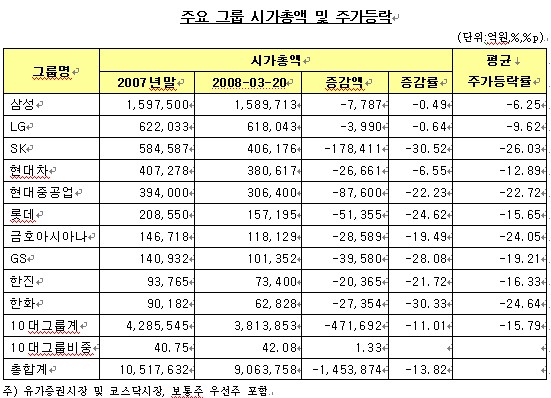 반면 삼성그룹은 증시 급락과 함게 특검 수사 영향에도 불구하고 7787억원(-0.49%) 감소에 그쳤고 재계 2위인 LG그룹은 3990억원(-0.64%)이 줄었다.