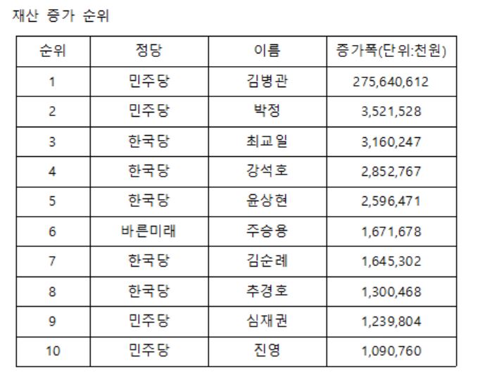최교일 한국당 의원(31억6024만 원), 같은당 강석호(28억5276만 원), 윤상현(25억9647만 원)이 재산 증가액 상위 5위에 포함됐다.
