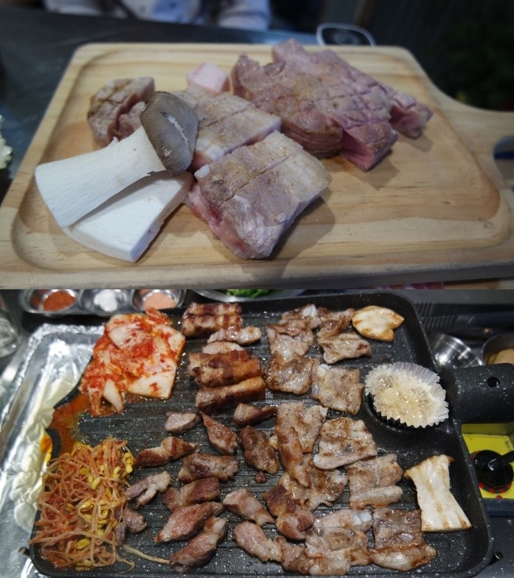 여기에 화끈한 불쇼가 펼쳐지면 불맛이 물씬 나는 맛있는 삼겹살과 목살을 즐길 수 있다.