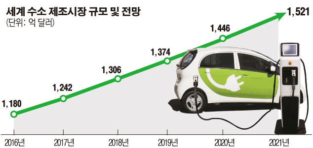이 같은 각국 행보에 따라 세계 수소 제조 시장 규모는 지속적으로 증가하는 추세다. 한국수소산업협회에 따르면 수소에너지 시장 규모는 2017년 1242억 달러에서 2021년 약 1521억 달러 규모에 이를 것으로 전망된다.