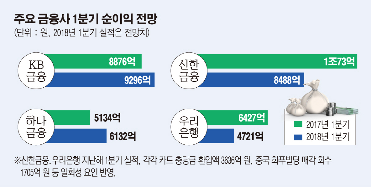 반면 지난해 1분기와 달리 일회성 요인이 사라진 신한금융지주와 우리은행의 경우 실적이 다소 줄었을 것으로 추정됐다. 올해 1분기의 경우 지난해 1분기와 달리 일회성 요인이 없기 때문이다. 신한금융의 경우 지난해 1분기 실적에 카드 충당금 환입액 3636억 원, 우리은행은 과거 중국 화푸빌딩 매각 회수 1705억 원 등이 반영됐다.