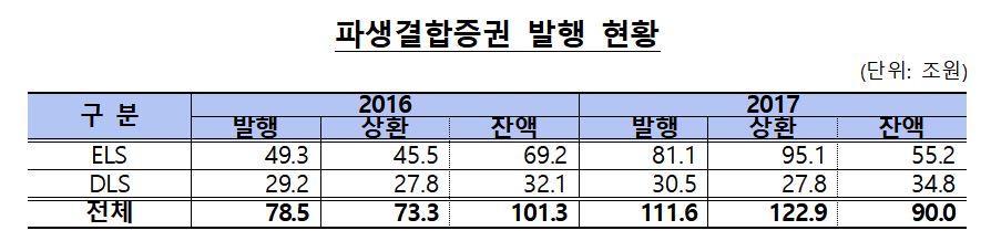 작년 국내외 증시 호조에 주가연계증권(ELS) 등 파생결합증권 시장에서 선순환 구조가 확립됐다. 이에 따라 상환금액과 발행금액도 각각 123조 원, 112조 원으로 자체 최고치를 경신했다.