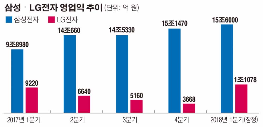 삼성전자는 반도체의 슈퍼호황과 갤럭시S9의 판매호조가 실적을 끌어올렸다. 반도체(DS) 부문에서 약 11조 원의 영업이익을, 스마트폰(IM) 부문에서 3조 원 안팎의 영업이익을 거둔 것으로 추정된다. LG전자는 프리미엄 가전제품(올레드 TV, 트윈워시 세탁기 등)의 판매 비중 확대와 함께 건조기·트롬 스타일러 등의 건강관리 기기의 판매 호조의 효과를 톡톡히 본 것으로 보인다.