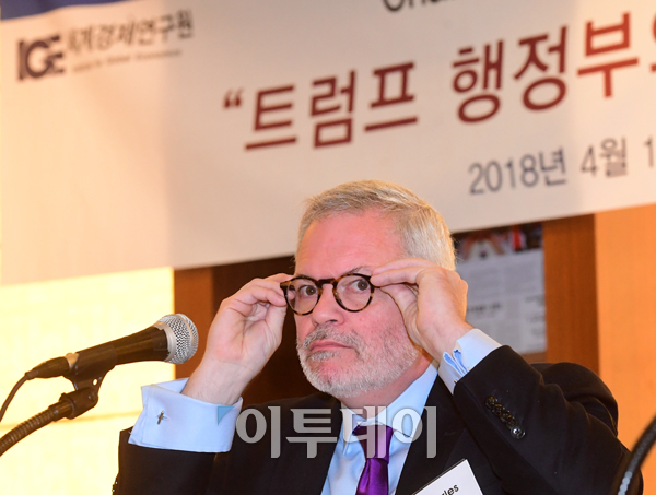 찰스 프리먼 미국상공회의소 선임부회장이 11일 오전 서울 중구 한국프레스센터 외신기자클럽에서 '트럼프 행정부의 한국 및 대아시아 무역·경제 정책'을 주제로 강연을 하던 중 안경을 고쳐쓰고 있다. 고이란 기자 photoeran@