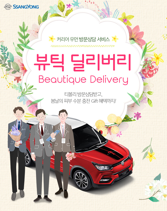 쌍용차는 바쁜 직장생활로 전시장을 내방하기 어려운 여성고객들을 위해 5월 한 달 동안 오토매니저가 피부관리를 위한 마스크팩과 함께 직접 방문·상담하는 ‘뷰틱 딜리버리(Beautique Delivery)’를 진행한다고 이날 밝혔다.
