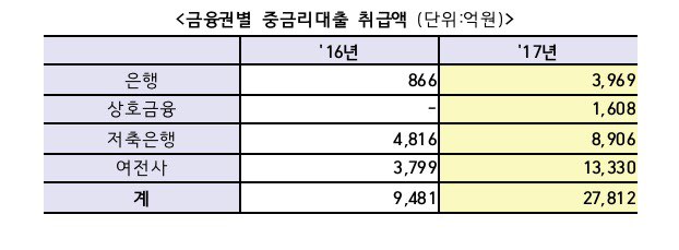 12일 금융위원회가 발표한 '17년 중금리대출 실적 및 제도 개선방향'에 따르면 금융권이 출시한 자체 중금리대출 규모는 2016년 9481억 원에서 지난해 2조7812억 원으로 2.9배 증가했다. 카드사 등 여신전문금융사가 1조 3330억 원으로 전년 대비 3.5배, 저축은행은 8906억 원으로 1.8배, 은행은 3969억 원으로 4.6배 늘었다.