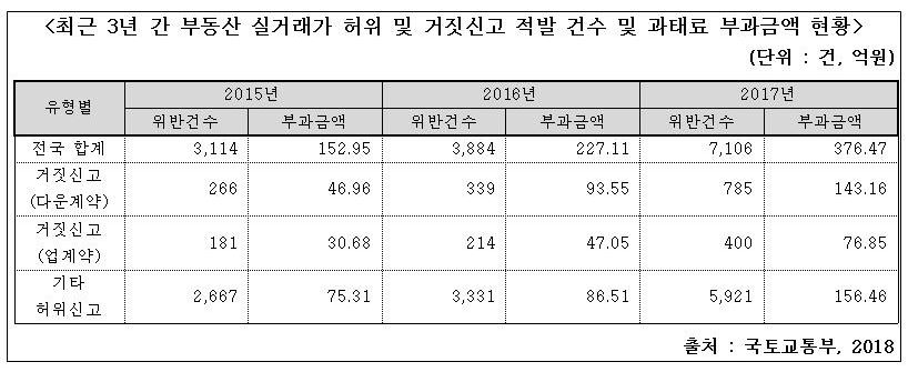 실제로 그 동안 국토교통부의 조사를 통해 적발된 허위신고 건수는 지난 2015년 3114건에서 지난해 7106건으로 3년 사이에 2배가 급증하는 등 증가 추세에 있는 것으로 드러났다.