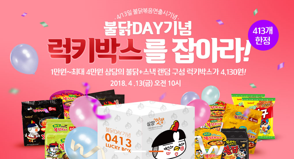 ‘불닭 럭키박스’ 이벤트는 4130원으로 1만~ 4만 원 상당의 불닭볶음면과 과자 등이 랜덤으로 들어있는 럭키박스를 받을 수 있는 행사다. 구매는 1인 1박스로 제한되며 413박스 한정판매된다.