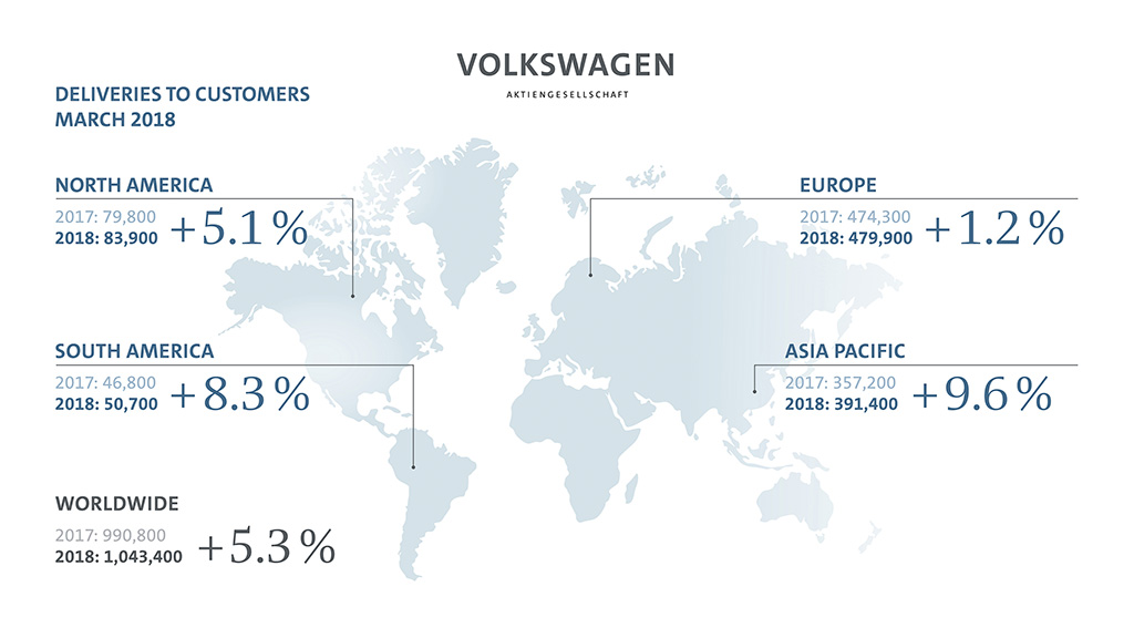 폭스바겐 그룹은 1분기 동안 유럽 지역에 전년 동기 대비 4.1% 증가한 114만대를 판매했다. 3월 한달 간 전년 동월 대비 1.2% 증가한 47만9900대를 판매했다. 이 중 독일 시장 13만100대를 포함해 서유럽에 40만7400대가 판매됐다. 중앙 유럽과 동유럽 인도량은 7만2500대로 전년 동월 대비 13.2% 증가했다. 1분기 동안 서유럽 지역에 전년 동기 대비 2.8% 증가한 95만4400대를, 중앙유럽과 동유럽 지역에는 11.4% 증가한 18만8900대를 판매했다.