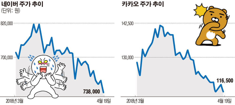 국내 포털 양대산맥 네이버와 카카오의 주가가 하염없이 추락하고 있다. 두 회사 모두 1분기 실적 부진이 예상되면서 외국인, 기관 투자자들의 동반 매도세가 확대되고 있다.
