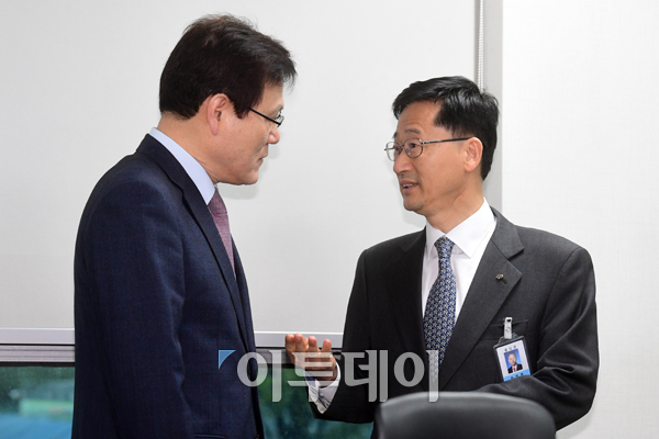 최종구(왼쪽) 금융위원장과 이정환 한국주택금융공사 사장이 24일 오전 서울 여의도 국회 의원회관에서 열린 서민·실수요자 주거안정을 위한 금융지원 당정협의에서 대화를 하고 있다. 고이란 기자 photoeran@