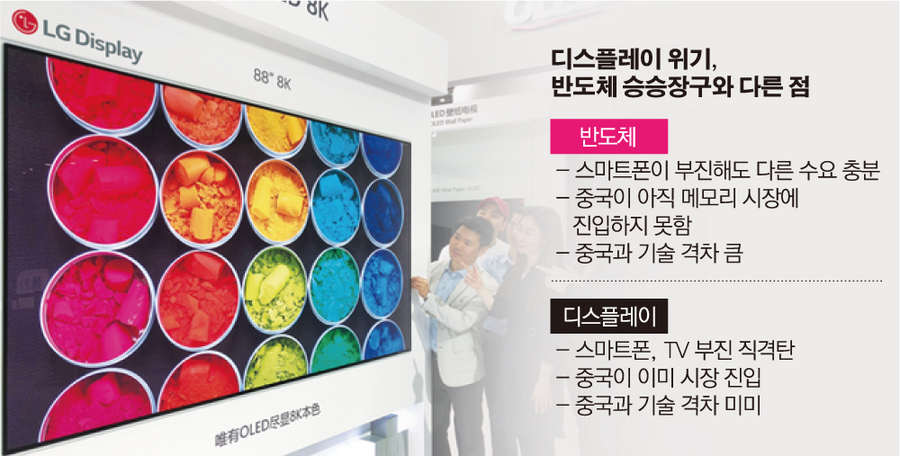 무엇보다 반도체와 디스플레이 업계의 가장 다른 점은 중국 기업들의 시장진입 여부다. 반도체 업계는 본격적인 중국발 공습이 시작되지 않았지만, 디스플레이에선 이미 중국 기업들이 공격적으로 공장 증설에 나서고 있다. 중국 디스플레이업체들은 출하량을 늘릴수록 중국 정부로부터 많은 보조금을 받기 때문에 손실 위험을 감수하며 적극적 물량 공세를 펼친다. 업계는 LCD패널 가격이 이른 시일 안에 생산원가와 맞먹는 수준까지 떨어질 가능성도 있다고 분석한다. 보조금을 받는 중국 기업과 달리 한국 업체들은 LCD패널을 생산할수록 오히려 손해를 볼 수 있다는 얘기다.