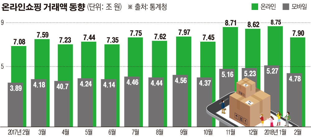 오프라인 유통 업태의 쇠락은 전자상거래 시장의 팽창으로 오프라인에서 온라인으로 헤게모니가 급속히 이동하면서 이미 예견된 일이었다. 통계청에 따르면 지난해 국내 전체 소매판매액은 440조1105억 원이며, 이 중 온라인쇼핑 거래액은 92조14억 원으로 20.9%를 차지했다. 올해 1, 2월에는 전체 소매판매액에서 온라인 비중이 각각 24.0%, 22.2%로, 10%대 초중반 수준이던 2016년 대비 10%포인트 가까이 높아졌다. 금액으로는 2조 원가량 불어난 것으로 나타났다.