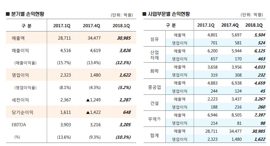 산업자재부문은 판매량이 증가하면서 매출액과 영업이익이 동시에 증가했다. 화학소재 부문은 정기 보수로 인해 매출이 감소했다. 중공업 부문은 전력시장의 부진으로 매출액과 영업이익이 줄어들었다.