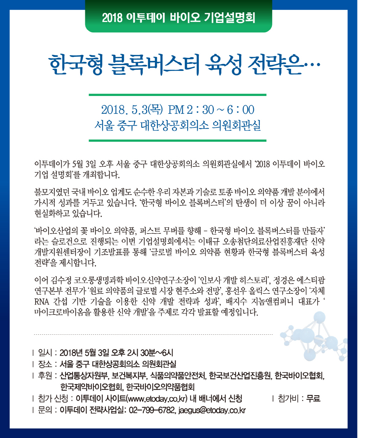 [알립니다] 한국형 블록버스터 육성 전략은… 5월 3일 ‘이투데이 바이오기업설명회’ 개최