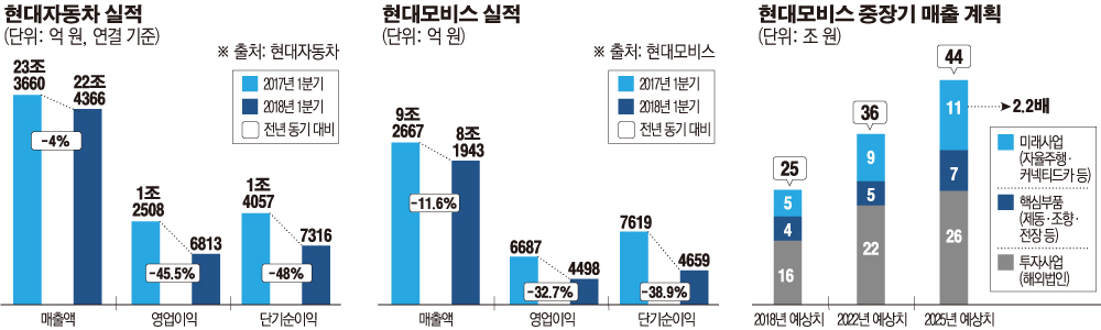 현대차는 올해 1분기 영업익이 전년 동기 대비 45.5% 축소된 6813억 원을 기록했다. 이는 시장 전망치인 약 9800억 원에 크게 밑도는 수치다. 같은 시기 이 회사의 매출액도 22조4366억 원으로 지난해 1분기보다 4% 줄었다. 순이익 역시 지난해 같은 기간보다 48% 감소한 7316억 원으로 집계됐다. 현대차의 실적 부진은 납품 의존도가 높은 현대모비스의 실적 하락의 원인이 됐다. 현대모비스는 올해 1분기 영업이익이 지난해 1분기 보다 32.7% 감소한 4498억 원을 나타냈다. 1분기 매출액은 8조1943억 원, 순이익은 4659억 원으로 작년 1분기보다 각각 11.6%, 38.9% 축소됐다.