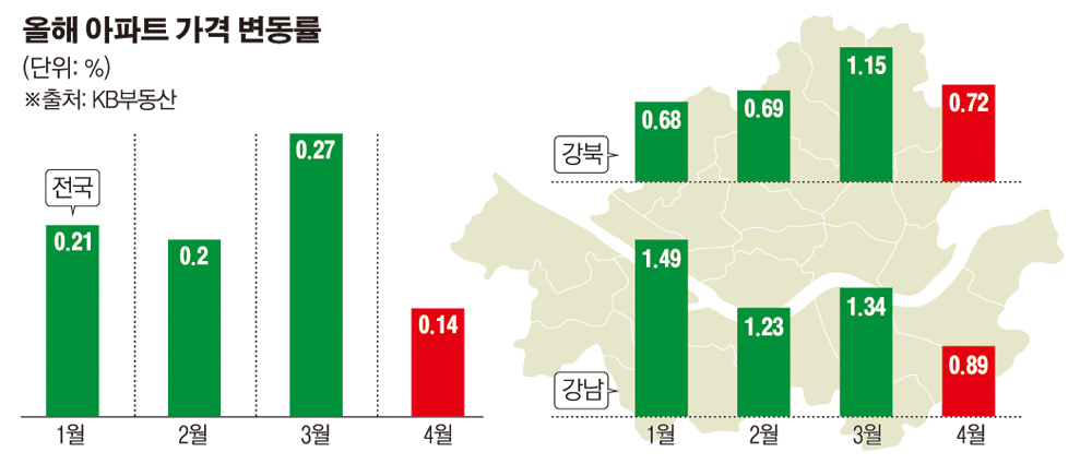 강북 아파트의 매매가 변동률 역시 다시 하락 전환했다. 지난 3월 7개월(작년 8월, 1.0%)만에 1%대로 올라서 1.15%를 기록했으나 지난달 다시 0.72%로 낮아졌다.