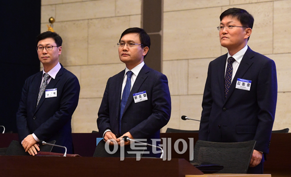 삼성바이오로직스 심병화 상무, 윤호열 상무, 김동중 전무(왼쪽부터)가 2일 서울 중구 대한상공회의소에서 열린 회계처리 위반 의혹 관련 긴급 기자회견에 참석하고 있다. 이날 삼성바이오로직스는 금융당국이 제시한 분식회계 의혹과 관련해 “회계기준 인식 및 적용에 대한 차이”이며 “이를 통해 부당한 이득을 취한바 없다”고 밝혔다. 고이란 기자 photoeran@