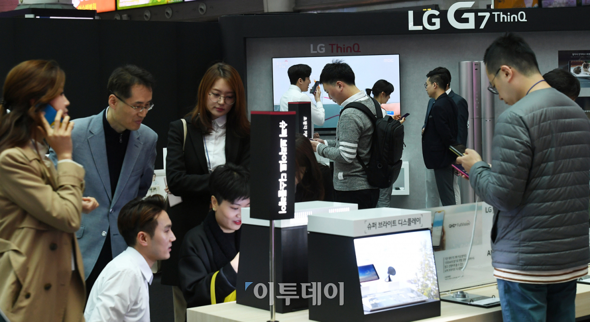 LG전자의 새 스마트폰 ‘LG G7 ThinQ(씽큐)’가 베일을 벗었다. 3일 오전 서울 용산역에 마련된 체험존에서 관람객들이 ‘LG G7 ThinQ(씽큐)’를 체험하고 있다. LG 스마트폰 중 가장 큰 6.1인치 화면으로 제작된 ‘LG G7 Thinq(씽큐)’는 ‘슈퍼 브라이트 디스플레이’와 ‘하이파이 쿼드 덱 ’, ‘원거리 음성인식’ 등 디스플레이, 오디오, 인공지능(AI)기능 등 차별화된 기술 탑재가 눈에 띈다. ‘LG G7 ThinQ(씽큐)’는 오는 11일 예약판매를 시작하며 18일 정식 출시한다. 오승현 기자 story@
