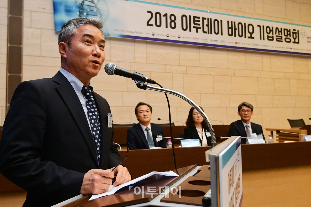 이승규 바이오협회 부회장이 3일 서울 중구 대한상공회의소에서 열린 2018 이투데이 바이오 기업설명회에서 격려사를 하고 있다. 이날 행사에서 이투데이는 "바이오산업의 꽃 '바이오의약품', 퍼스트무버를 향해-한국형 바이오 블록버스터를 만들자"를 슬로건으로 참석자들에게 유망 바이오 벤처 발굴과 투자유치를 위한 기회를 공유했다. 고이란 기자 photoeran@