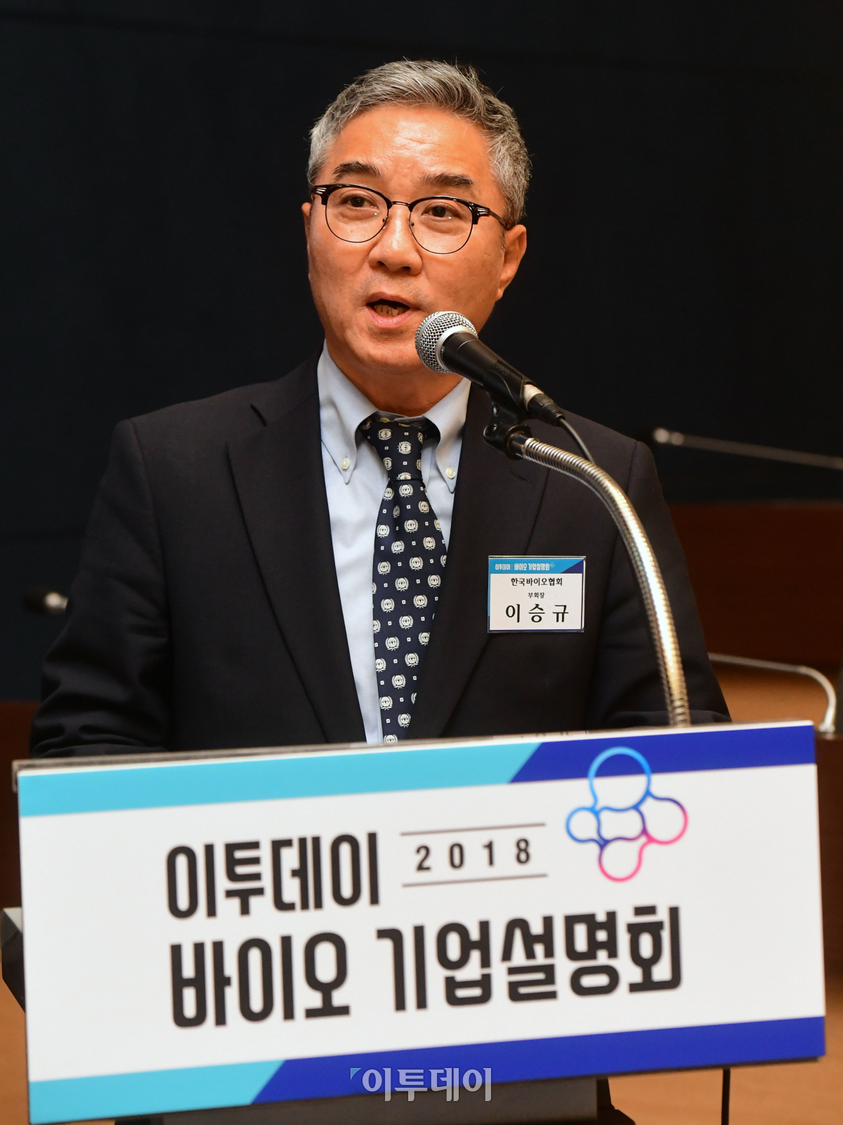 이승규 바이오협회 부회장이 3일 서울 중구 대한상공회의소에서 열린 2018 이투데이 바이오 기업설명회에서 격려사를 하고 있다. 이날 행사에서 이투데이는 "바이오산업의 꽃 '바이오의약품', 퍼스트무버를 향해-한국형 바이오 블록버스터를 만들자"를 슬로건으로 참석자들에게 유망 바이오 벤처 발굴과 투자유치를 위한 기회를 공유했다. 고이란 기자 photoeran@