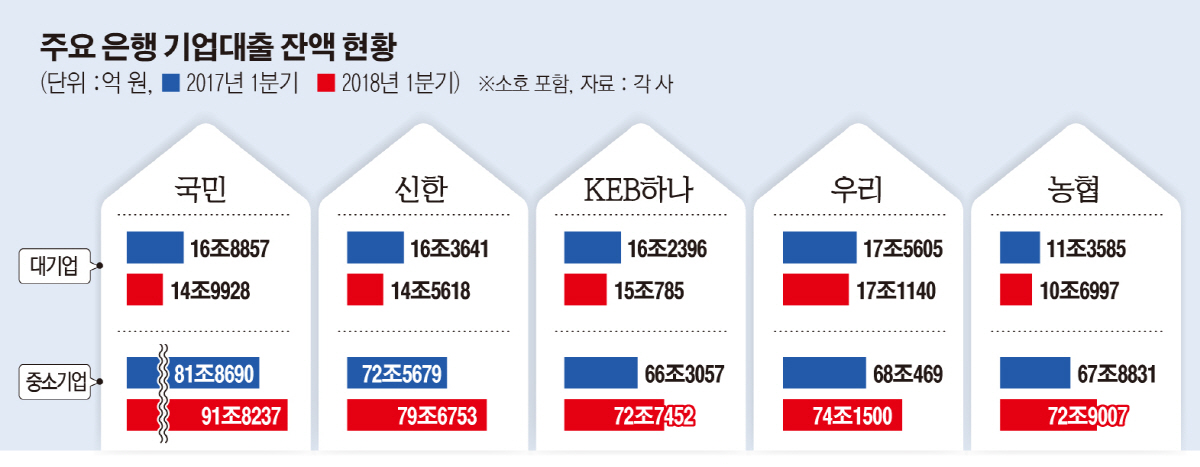 4일 KB국민·신한·KEB하나·우리·NH농협은행 등 주요 5대 시중은행의 기업여신 자료에 따르면 올해 1분기 기준 전년 동기대비 대기업 대출은 5조 9616억 원 감소한 반면 중기대출은 34조 6223억 원 늘었다. 주택담보대출을 늘리기 힘들어진 은행들이 중기대출 증대로 방향을 선회한 것이다. 여기에 올해 경영종합평가(KPI)에서 중소기업 대출 배점이 높아진 상황도 한몫했다.