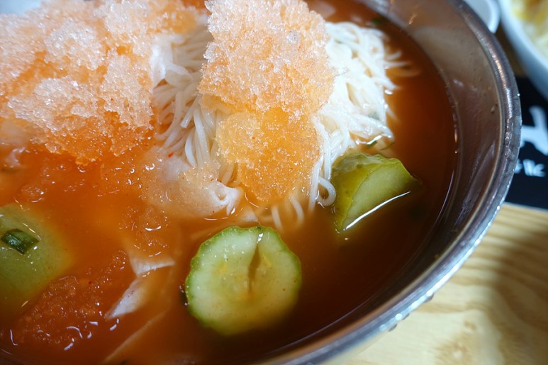 붉은 빛깔의 국물에 오이소박이가 들어간 국수 위에 빙수가 올라간 모습이 바라만 봐도 시원함을 느끼게 한다.